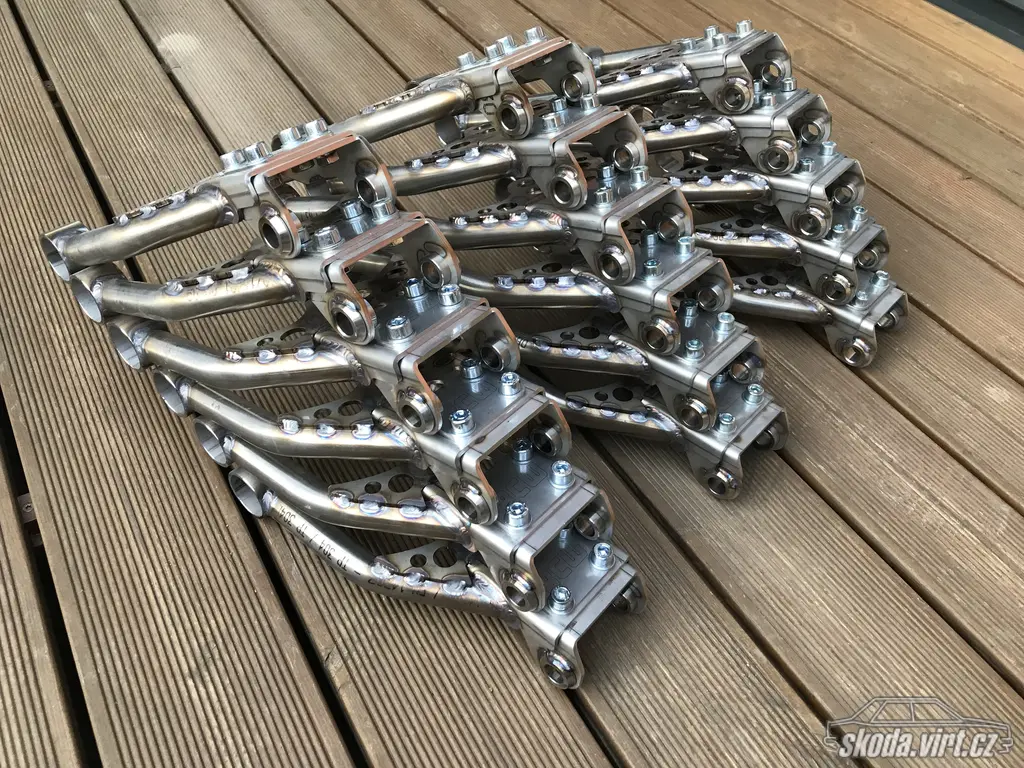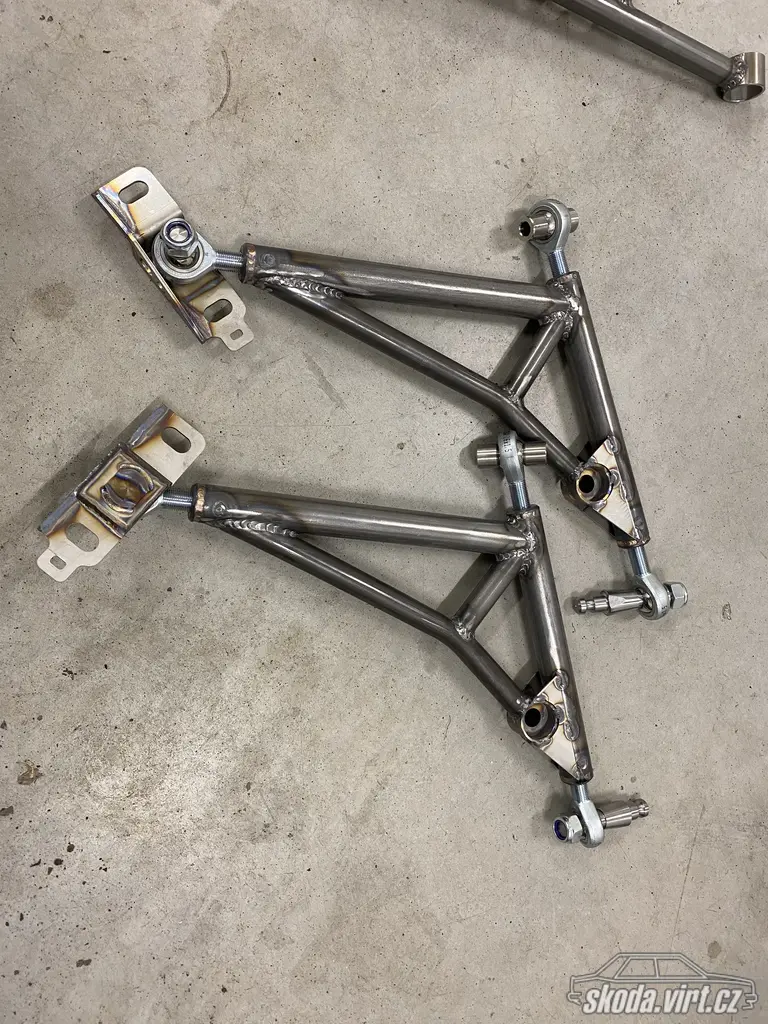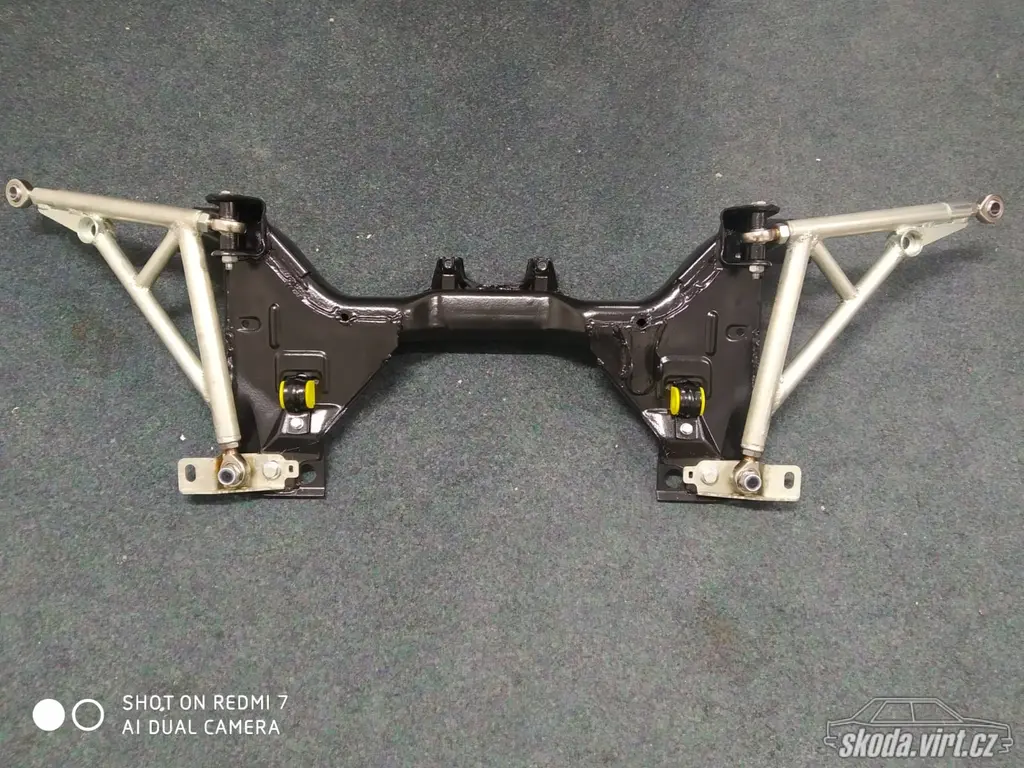 Spodní trubková ramena - náprava typu M. Standartní záklon 6,5°. Uložení tlumiče s pružinou COILOVER, stabilizátor na unibal.