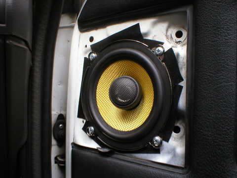 A teď repro... protože to je Peugot 205 do dveří, byli sme limitování konstukčním průměrem 120mm čili 13tky repráky a pod originální plast mřížku. Protože se v blízké budoucnosti počítá s předěláním doorboardů a poté koupením kvalitnějších repro rozměru 16cm nebo více s mezikroužkem s MDF, vybírali sme v levných noname reprákach.