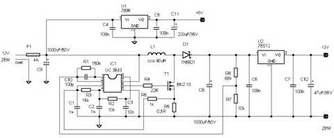 Jinak měničů s tímto obvodem je hodně, ale našel jsem i takovej, kterej měl na výstupu stabík 7812 posílenej tranzistorem a 7805ku napojenou za měnič