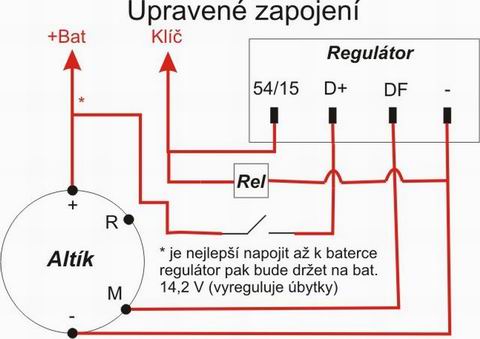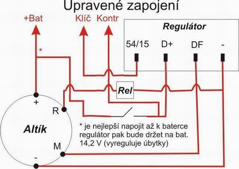 Dneska jsem to zkoušel v práci a orig. plechovej el. regulátor a ještě Jezpol nabudí díky vnitřnímu zapojení spolehlivě alternátor i bez zapojené kontorlky na kontak D+ regulátoru. Každopádně se zdá tvé řešení dokonalejší - vyzkouším ho