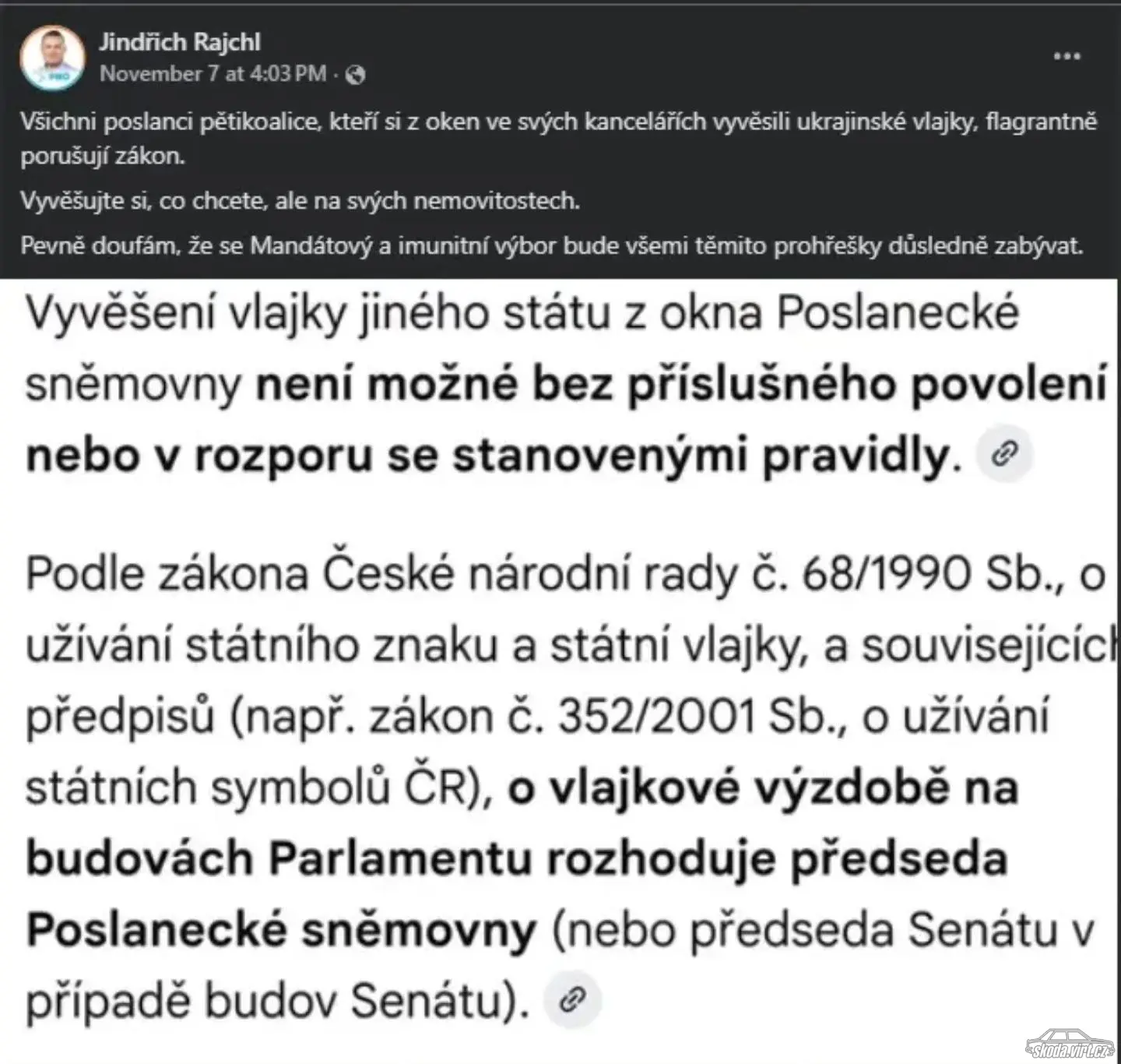 To si tak přes ChatGPT vycucáš z prdele znění zákona, kterej od roku 2001 neexistuje a neexistuje žádná právní úprava, která by vyvěšování cizích vlajek řešila, ale našilidi už jdou na barikády a nejradši by celou opozici popravili.